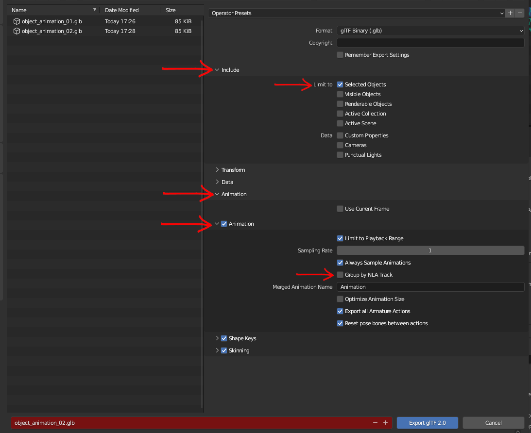 - When exporting the glTF model, confirm that you’re exporting all the objects and animations. Some exporters will only export the currently selected by default.