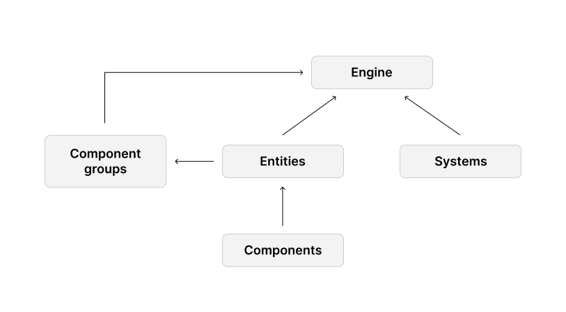 📔 Note: Only entities that are added to the engine are eligible for component groups. Entities that have been created but not added to the engine, or that have been removed from the engine, aren’t listed in any group.