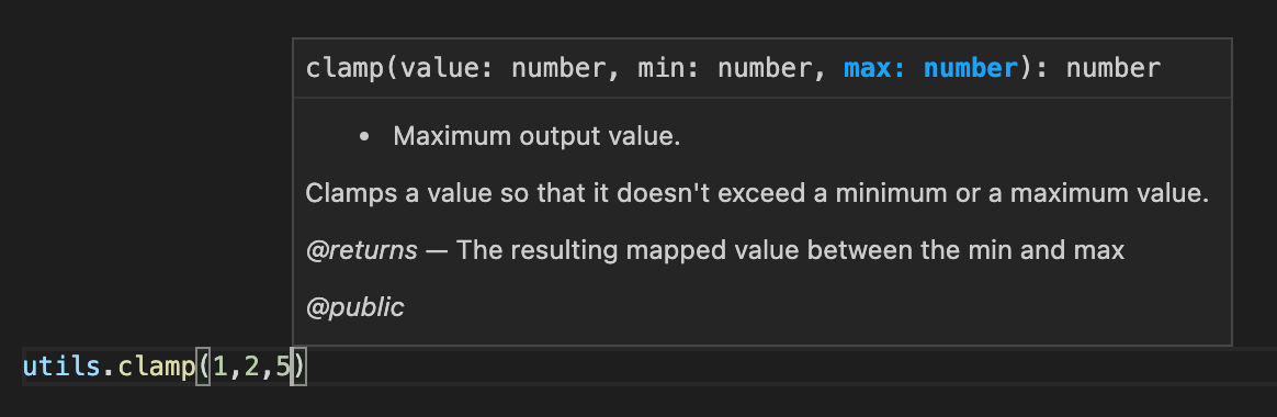 @dcl/ecs-scene-utilslibrary:/** * Clamps a value so that it doesn't exceed a minimum or a maximum value. * * @param value - input number * @param min - Minimum output value. * @param max - Maximum output value. * @returns The resulting mapped value between the min and max * @public */ export function clamp(value: number, min: number, max: number) { let result = value if (value > max) { result = max } else if (value < min) { result = min } return result }Users of this library see these hints displayed as they type the
