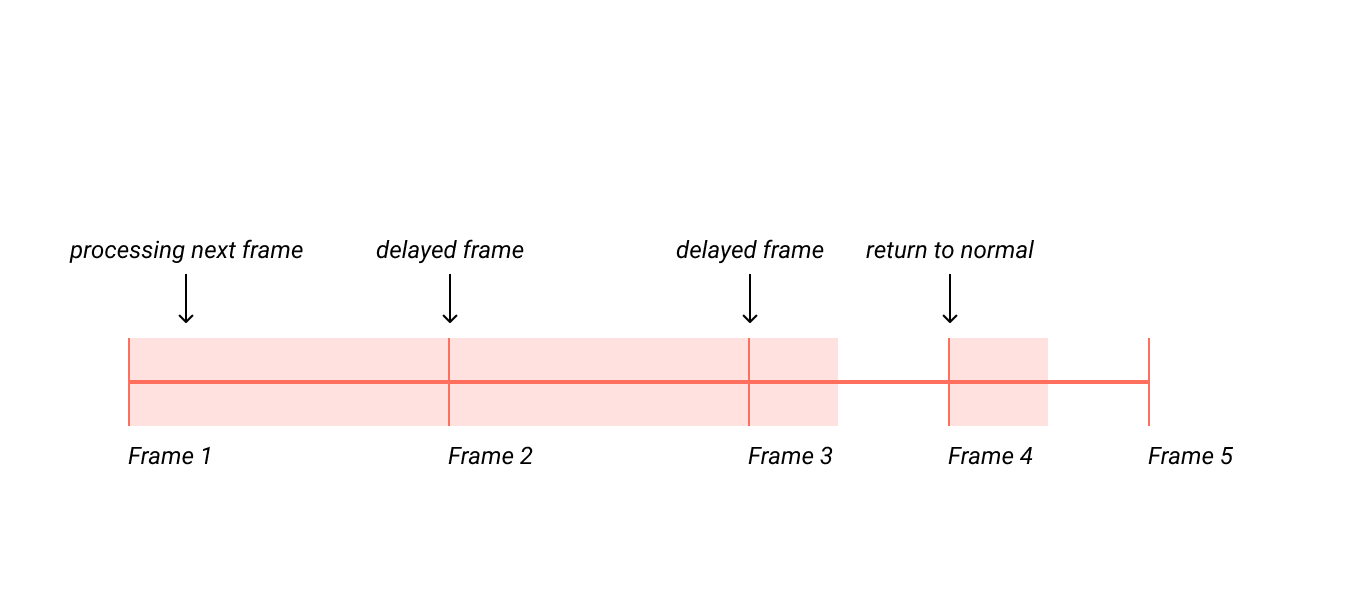 If the processing of a frame takes longer than 30/1000 seconds, the drawing of that frame is delayed. The engine then tries to finish that frame and show it as soon as possible. It then proceeds to the next frame and tries to show it 30/1000 seconds after the last frame. It doesn’t compensate for the previous delay.