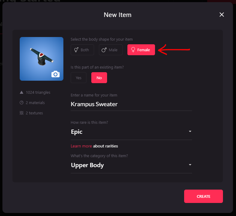 When you upload the file, you will be asked to select a body shape, enter a name and define the rarity and the category. You can also add the thumbnail for the wearable.