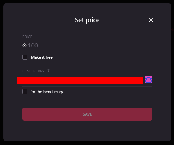 You could also Make it Free, which means that the price will be set as 0 MANA and the beneficiary address will be null. Know that making it free (primary sale) does not prevent it from being sold at any price as a secondary sale.