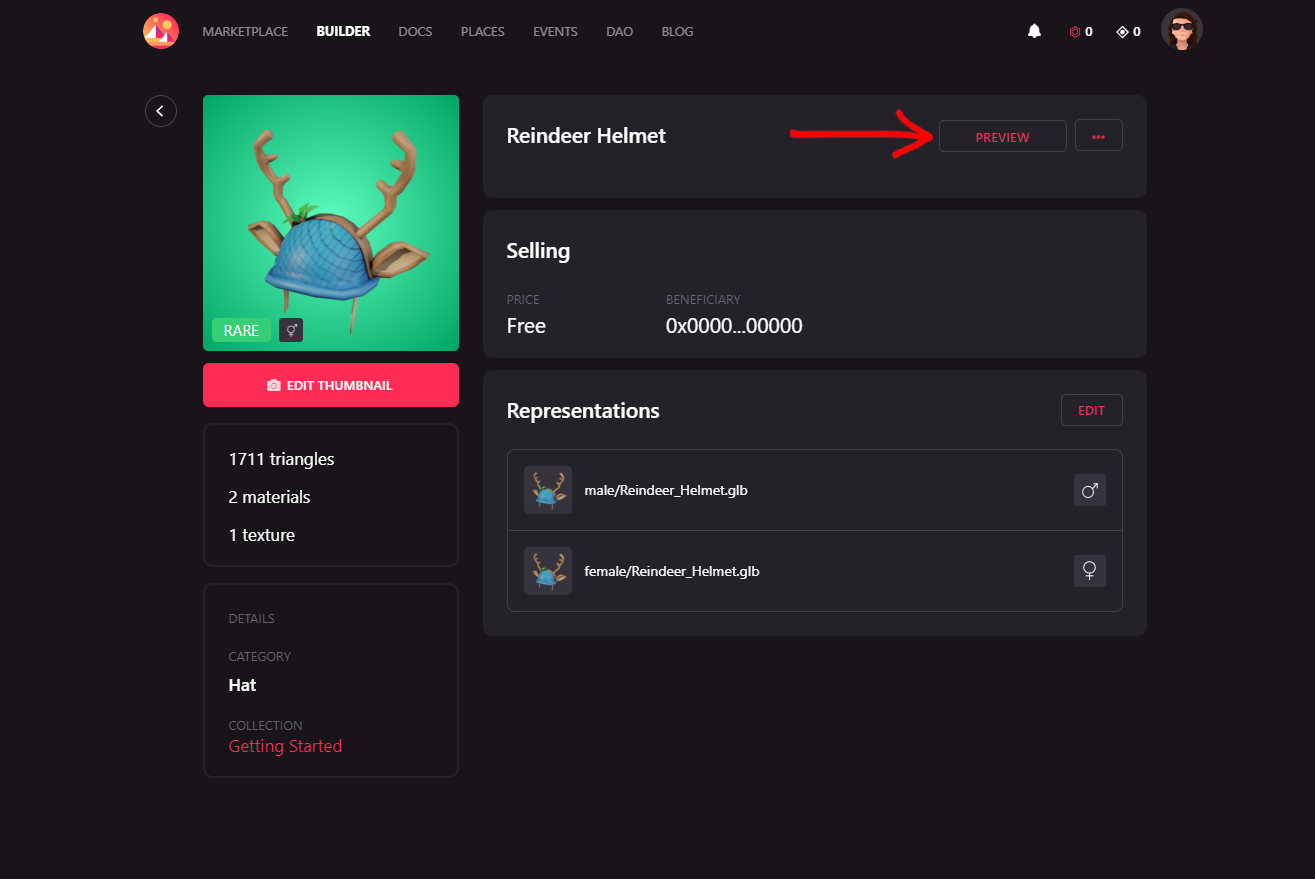 Save the price and you will be back to the list of wearables in your collection. When you click on the item, you will get its general info. Click on the button Preview to see it on the editor.