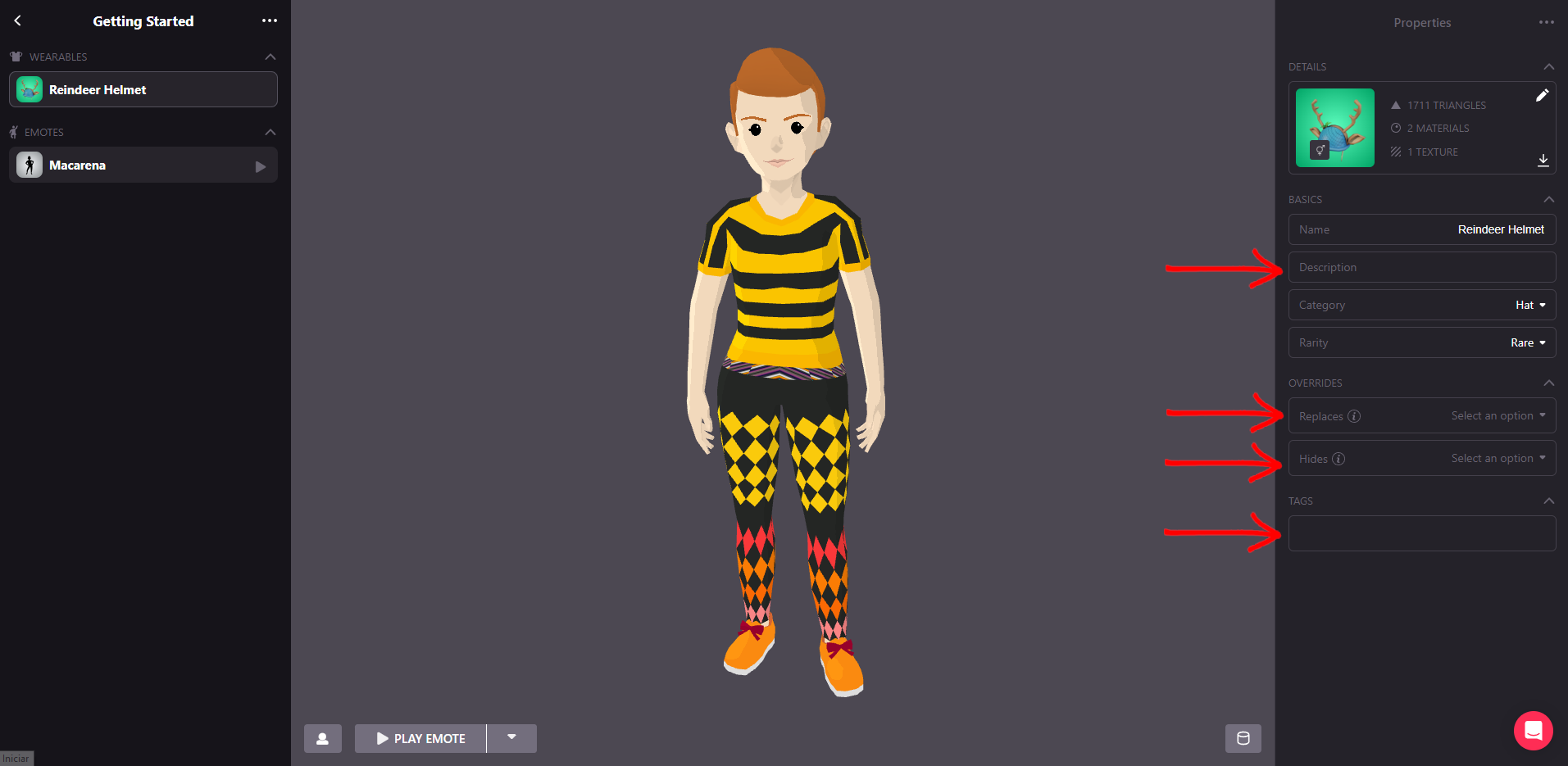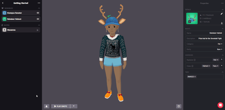 Below the thumbnail you’re going to find the properties of your wearable, number of triangles of your model, number of materials and textures.