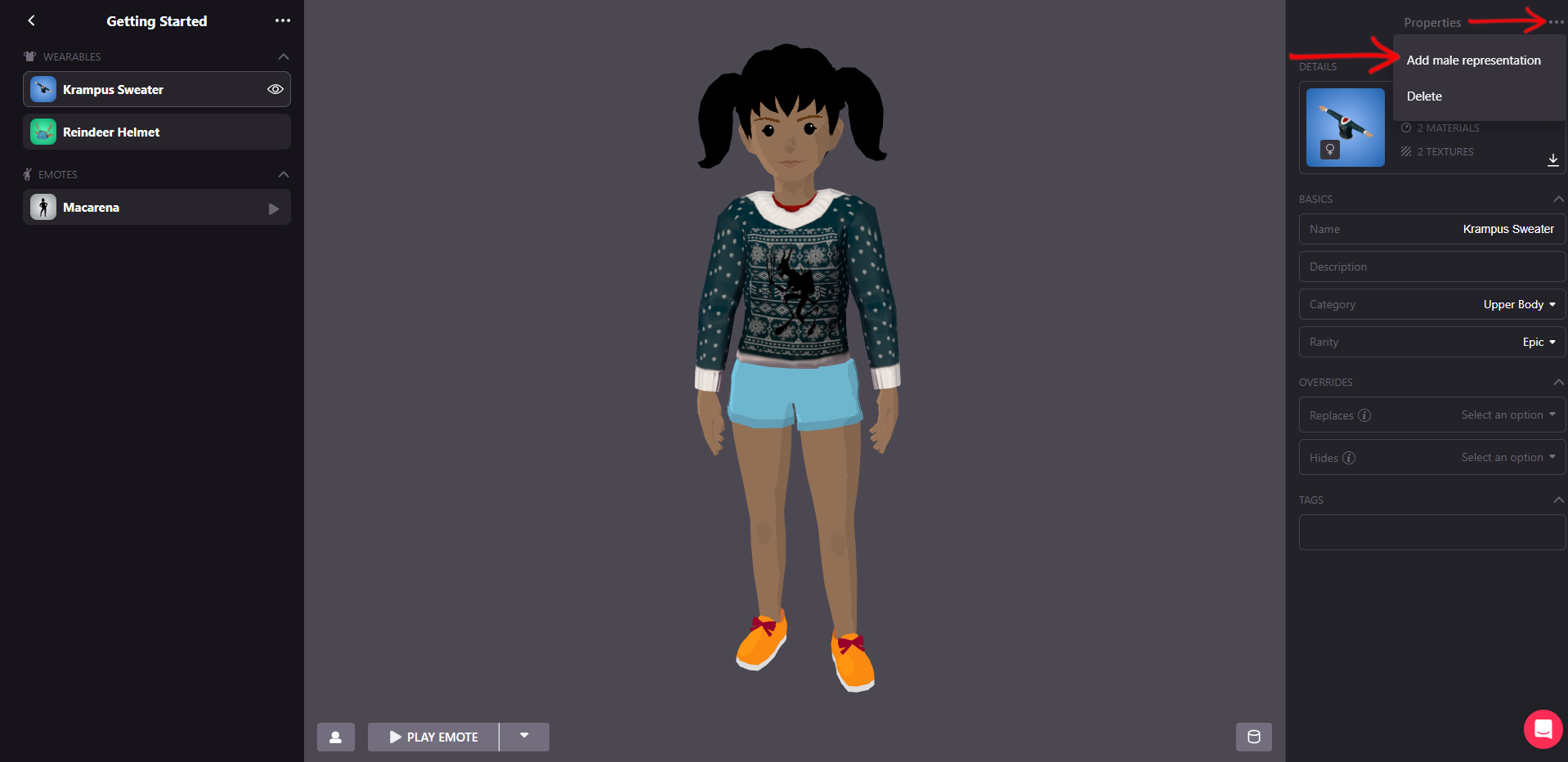 If your wearable has a different representation for male and female you will need to upload another file. So far, you only have one uploaded. In the example, it was the female version of the Krampus Sweater. To add the other representation, click on the three dots (…) at the top right, next to Properties and select Add male/female representation. In the example below, we needed the male version.