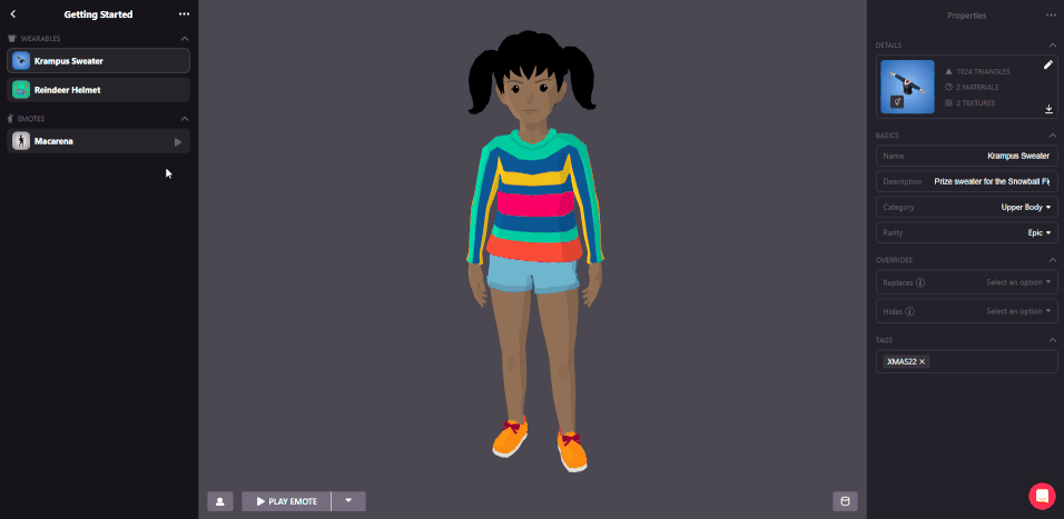 By clicking on the icon at the lower left you will be able to edit the avatar. This is pretty useful if you have a male and female version of your wearable, so make sure to check how both versions look like in editor, testing different emotes to identify if there are any skinning issues and mixing other wearables to see how it matches with different clothes. When you’re done editing your wearable, click on Save.