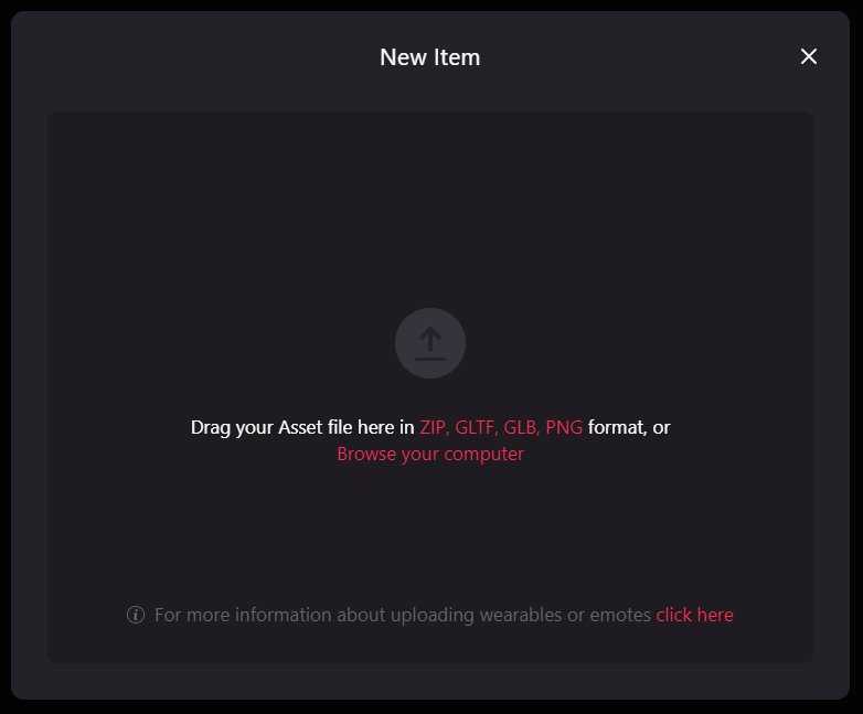 Remember that you need to create a collection before you can upload your file. If you don’t know how to do that, check Creating a Collection . To upload your emote, just drag and drop the file on the New Item window or browse your computer. It will automatically detect if the file has any animation, identifying it as an emote.