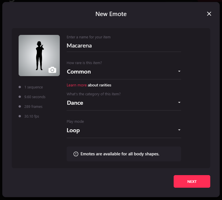 You will be asked to enter a name for your emote, define its rarity, the category and the play mode. Below the thumbnail is shown the number of animation clips in your file, the length of the animation in seconds, the length in frames and the frame rate.