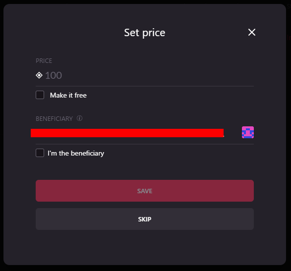 Next, you will have to set the price of your emote and the beneficiary address. This can all be edited later on, so don’t worry if you haven’t decided on the price yet. You can skip this for now by clicking on Skip. Or you can set whatever price you want, click on Save and edit that before you actually publish the emote.