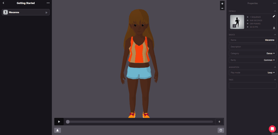 Once you set a price or skip it, you will have the editor open. This is where you can check if the animation is playing well since a 3D avatar will be performing it.