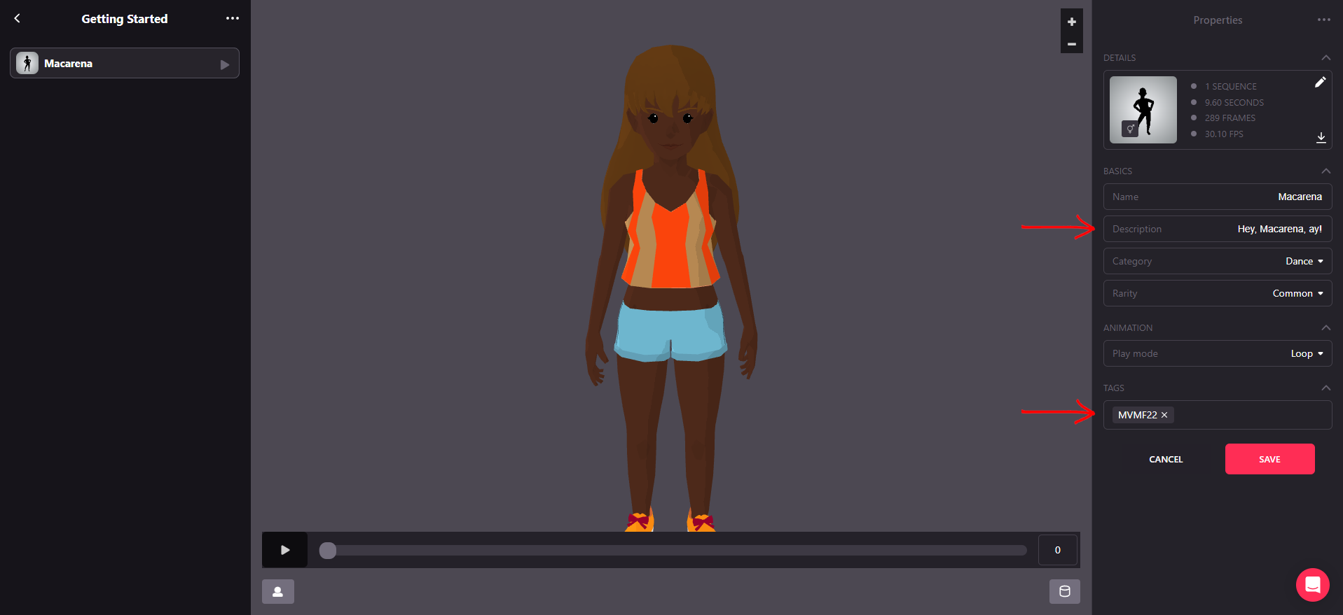 You can also edit the emote’s name, thumbnail, category, rarity and play mode, as well as add a description of the animation and add tags to it. Click on Save when you are done.