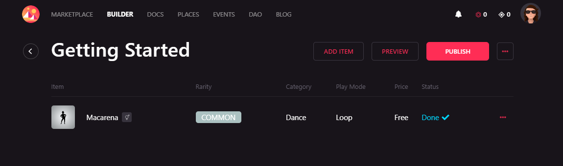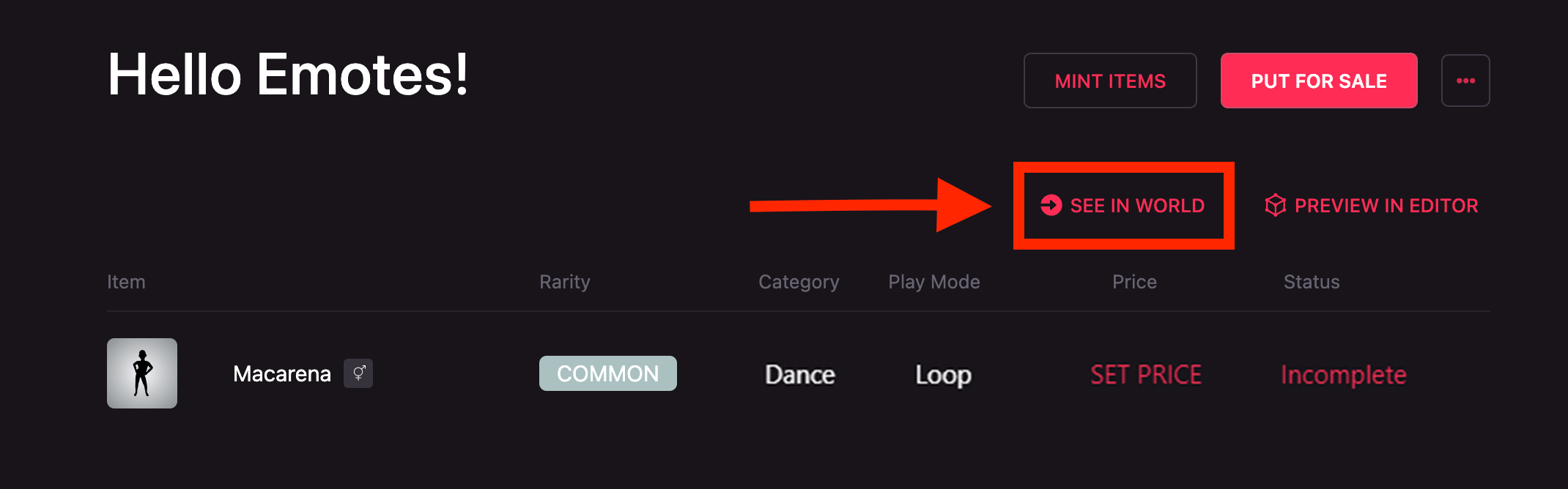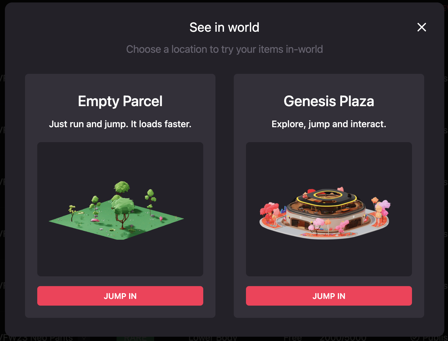 Even after testing the animation in the editor, it’s important to check how it’s actually going to look like and behave in Decentraland. To test it in world, go to the Collections tab, select the desired collection and it will show all the items you have in it. Select the desired collection and click the button See in World.