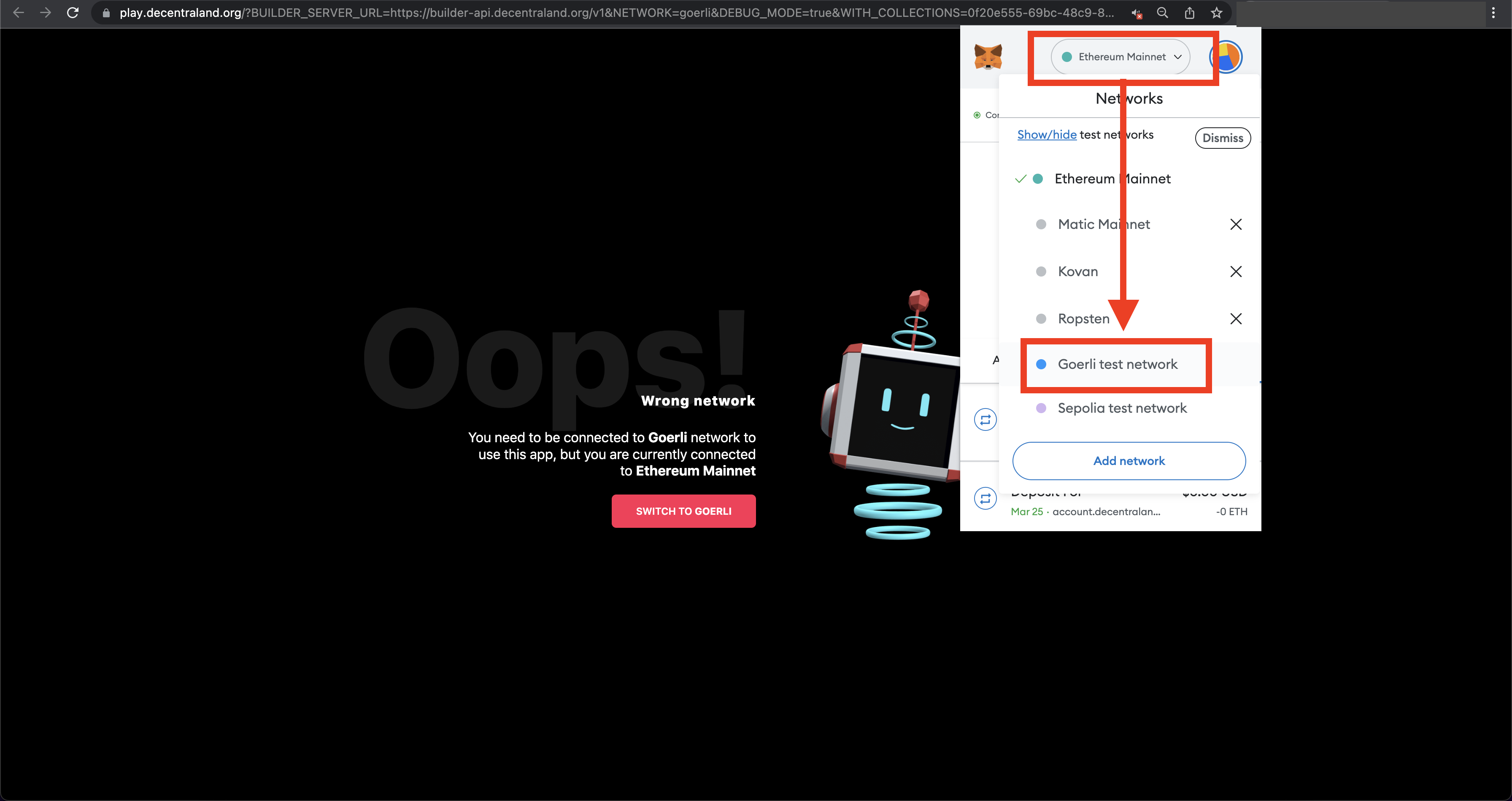 Click on Switch to Goerli and a popup from your wallet will show up asking to switch the network. Simply click on Switch Network and the new tab will automatically refresh. To test your wearable, go to the backpack and select it.