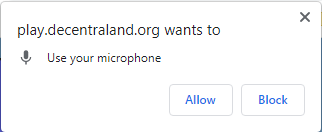 By keeping pressed the microphone button (or the T key), you will be able to send audio messages to the nearby users also connected to the Voice Chat. It is possible that the first time you do this, the browser will ask you about microphone permissions. You will see a browser’s modal similar to this